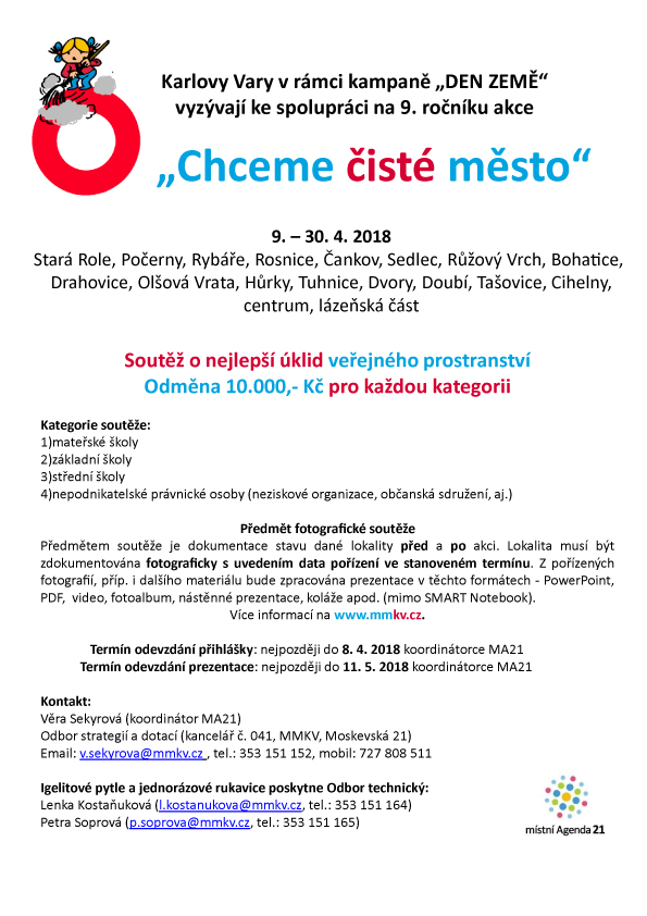Úklidová akce je naplánována pro všechny městské čtvrti v termínu 9. – 30. dubna 2018. Město poskytne zájemcům o úklid potřebné prostředky (odpadkové pytle, rukavice) a v případě potřeby zajistí úklid odpadu po akci. Je tedy nutné nahlásit kontaktní osobu. Z důvodu koordinace úklidu se musí každý zájemce přihlásit prostřednictvím formuláře, který je ke stažení níže, případně k vyzvednutí u koordinátorky akce nebo pracovníků odboru technického. Přihlášku zájemce odevzdá nebo odešle koordinátorce Věře Sekyrové (v.sekyrova@mmkv.cz) do 8. dubna 2018.