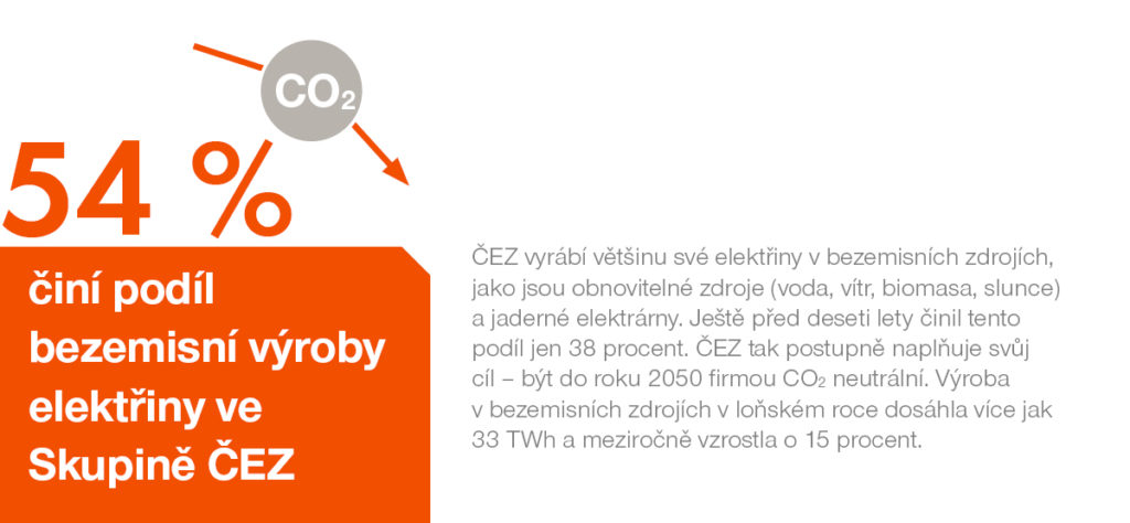 ČEZ vyrábí většinu své elektřiny v bezemisních zdrojích, jako jsou obnovitelné zdroje (voda, vítr, biomasa, slunce) a jaderné elektrárny. Ještě před deseti lety činil tento podíl jen 38 procent. ČEZ tak postupně naplňuje svůj cíl – být do roku 2050 firmou CO2 neutrální. Výroba v bezemisních zdrojích v loňském roce dosáhla více jak 33 TWh a meziročně vzrostla o 15 procent.