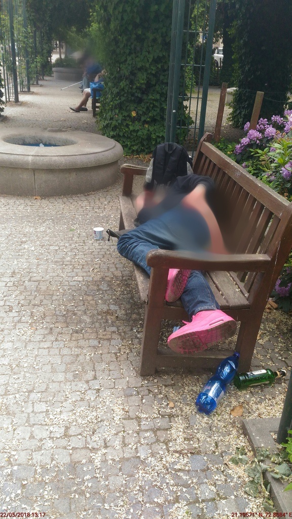 V odpoledních hodinách se vydala hlídka do Šafaříkových sadů. Lidem procházejícím parkem se naskytl pohled na opilou obnaženou ženu ležící na lavičce.  Strážníkům je tato žena dobře známá z předchozích činností.  Odmítala s nimi hovořit a vykřikovala opět nesmyslné fráze. Ve svém stavu nebyla schopná podrobit se dechové zkoušce ke zjištění hladiny alkoholu v dechu.