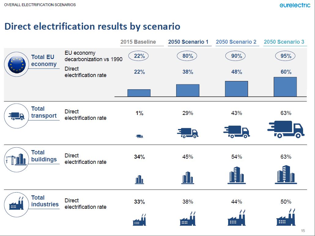 Pokud chce Evropa do poloviny století významně snížit své uhlíkové emise, neobejde se bez výrazné elektrifikace. Podle studie EURELECTRIC by měl podíl elektřiny na spotřebě při středním scénáři stoupnout z dnešních zhruba 22 na 48 %. Nejambicióznější verze pak počítá s až 60 %. Nejvíce se to projeví v dopravě, ale rovněž v oblasti výrobního průmyslu, rezidenčního bydlení a v komerčních realitách. EURELECTRIC očekává, že do roku 2050 poroste poptávka po elektřině ve 32 evropských zemích středním tempem 1,8 % ročně.