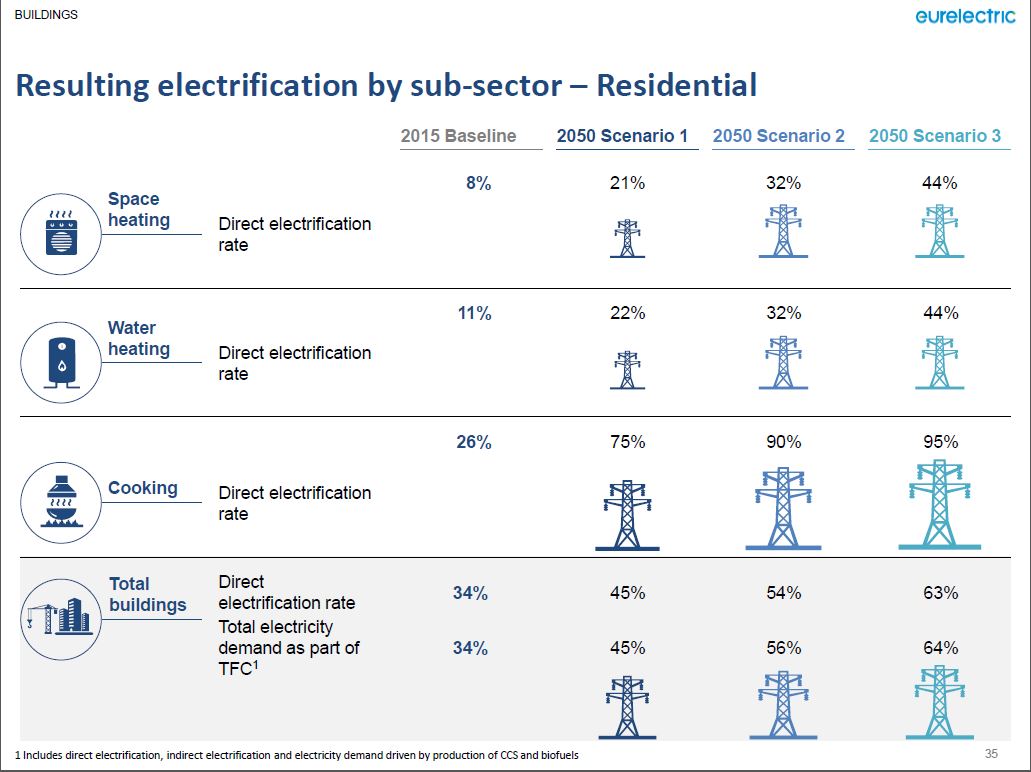 Významnější roli má elektřina hrát i v oblasti bydlení. Zde jsou podle EURELECTRIC největší rezervy ve vytápění – elektřinou topí jen jedna z 12 budov pro běžné bydlení, pro ohřev vody ji využívá každá desátá. Ani komerční budovy na tom nejsou o moc lépe. Podle středního plánu má elektrifikace všech budov stoupnout z dnešních 34 na 54 %. Hlavní roli podle studie bude hrát zavádění tepelných čerpadel. V případě dálkového vytápění, které hraje významnou roli i v České republice, počítá EURELECTRIC s rostoucím podílem bioplynu a vodíku.