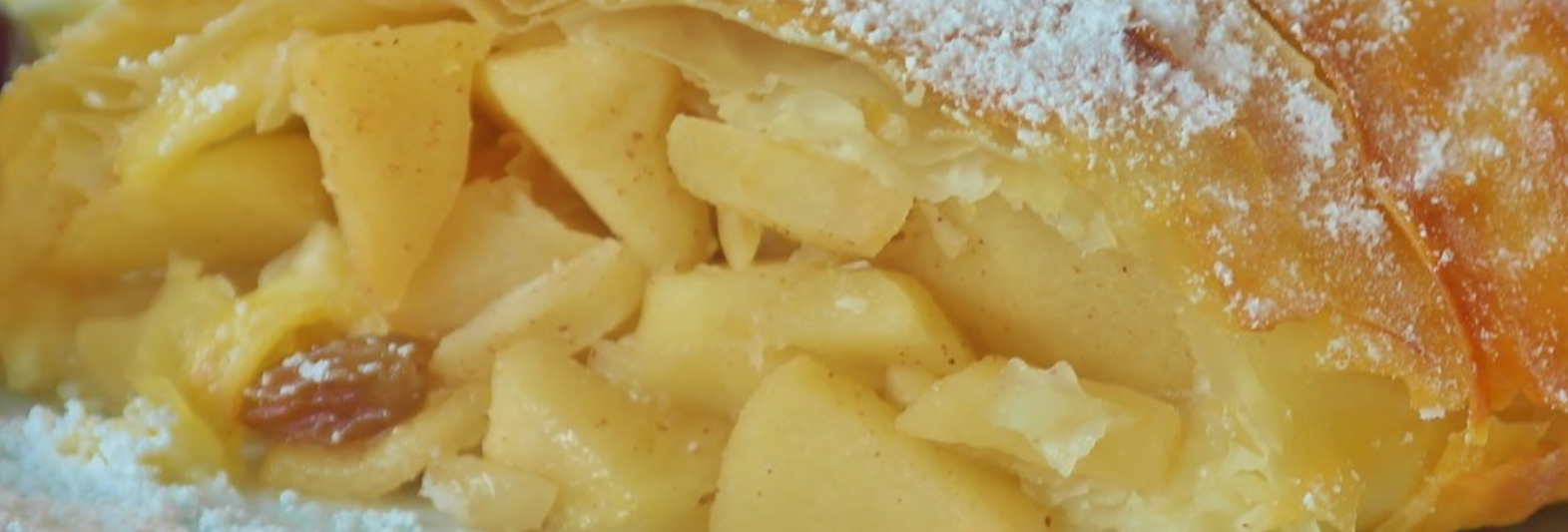 300 g hladké mouky, ½ kostky ztuženého tuku, 16 lžic piva, strouhaný perník, jablka, skořice, cukr, oříšky, rozinky