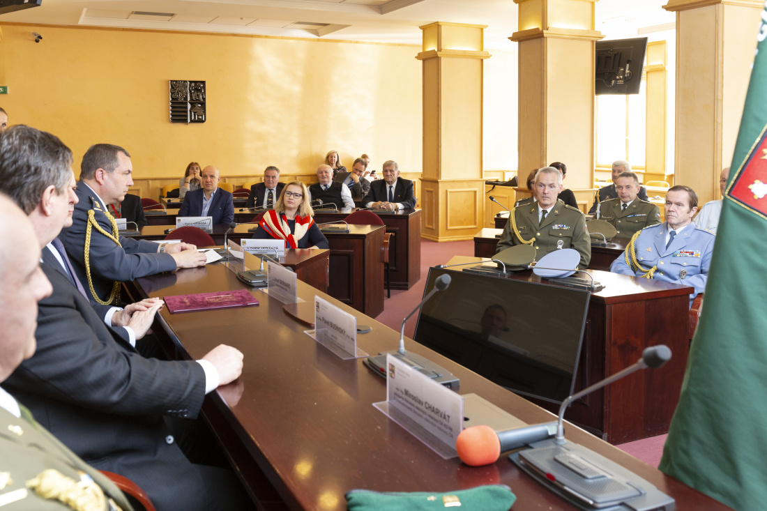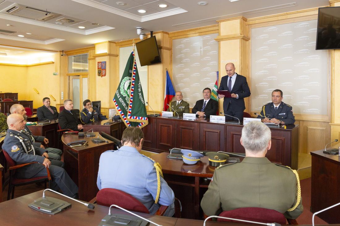 Váleční veteráni, zástupci Krajského vojenského velitelství Plzeňského kraje a zástupci Sdružení válečných veteránů ČR a Krajské organizace Plzeňského kraje se sešli s hejtmanem Josefem Bernardem a radní Radkou Trylčovou u příležitosti předání nové vlajky Krajské organizaci Plzeňského kraje Sdružení válečných veteránů.