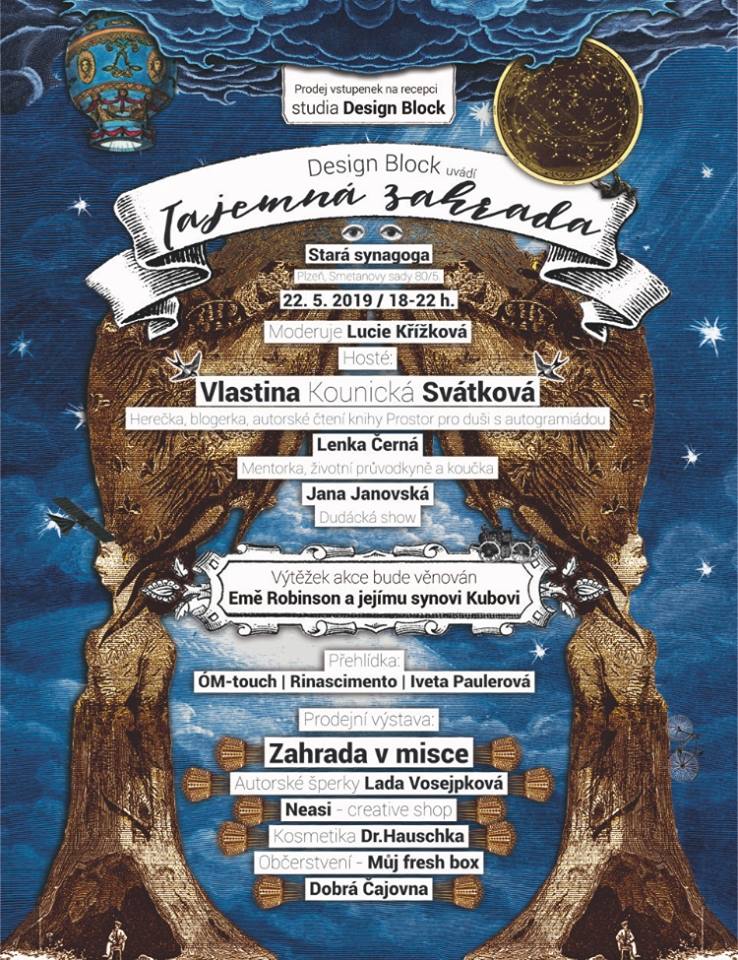 Unikátní prostor plzeňské Staré synagogy, ukryté ve vnitrobloku mezi Smetanovými sady a Americkou třídou, bude 22. května hostit inspirativní akci nejen pro ženy s názvem Tajemná zahrada. Moderátorka Lucie Křížková přivítá na pódiu herečku a spisovatelku Vlastinu Svátkovou, mentorku a koučku Lenku Černou nebo hudebnici hrající na dudy Janu Janovskou. Kromě módních přehlídek značek ÓM TOUCH, Rinascimento a návrhářky Ivety Paulerové nebudou chybět autorské šperky, koncept propojení rostlin s městským životem, přírodní kosmetika či zdravé občerstvení. Organizátorem je plzeňské studio Design Block a výtěžek večera bude věnován na dobrou věc.