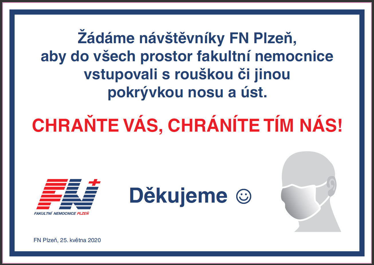 Důležitou informací pro veřejnost je povinnost vstupovat do všech prostor FN Plzeň s rouškou či jinou pokrývkou úst a nosu.