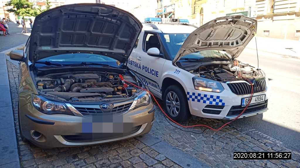 Mobilní telefon se už stal součástí našich životů a někteří z lidí ho neodloží ani ve chvílích, kdy usedají za volant vozu. Stejně se zachoval v pátek dopoledne 78letý řidič jedoucího vozidla Subaru v Plzni po Americké ulici. Hlídka ze služebny Městské policie Plzeň-Střed jej zahlédla, jak za jízdy telefonuje, a proto jej zastavila. Nemilé překvapení čekalo ale na řidiče po vyřešení přestupku. Své vozidlo se pokoušel nastartovat, ale marně. Příčinou byla vybitá autobaterie. Strážníci mu pomohli z této situace se dostat. Pomocí startovacích kabelů se podařilo auto nastartovat.