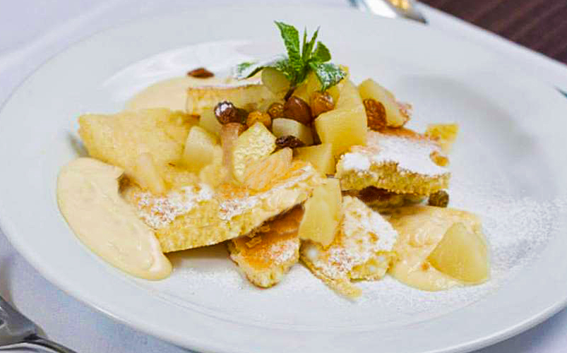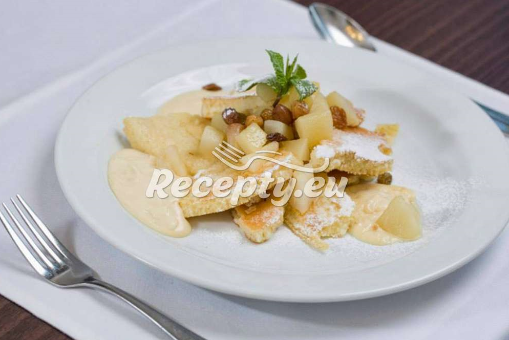 Na větší vrstvě rozpuštěného másla těsto opečeme. Jakmile bude spodní vrstva opečená, omeletu roztrháme. Až budou kousky křupavé, dáme na talíř a posypeme moučkovým cukrem.