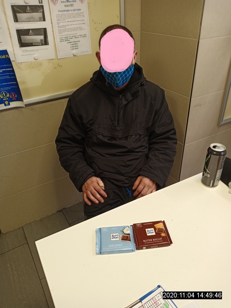 K případu druhé krádeže, která se stala odpoledne v obchodě v Plzni na Americké třídě, dorazili také policisté. Ostraha prodejny přistihla při krádeži zboží 32letého muže z Tachovska. Na pokladně zaplatil jen pečivo a energy drink. Na dvě čokolády, které si strčil do kapsy u bundy a prošel skrz pokladnu bez úhrady za ně, údajně prý zapomněl. Strážníkovi navíc přiznal, že byl před pár týdny propuštěn z vazby za drobné krádeže a má mít vysloven soudem na katastrálním území města Plzně zákaz pobytu. Právní zájem policistů potvrdila následně provedená lustrace. Republikoví policisté si muže na místě převzali k dalším šetřením.