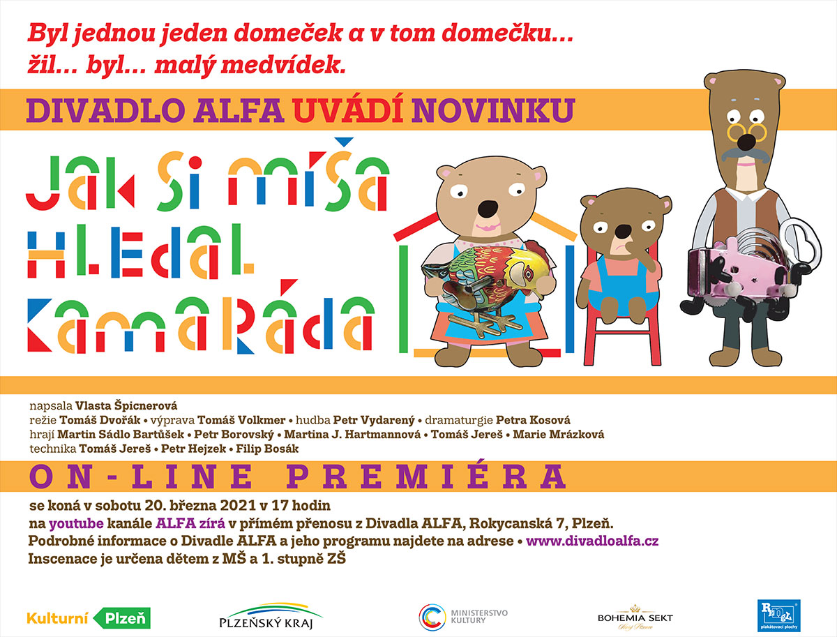 Nová premiéra Divadla Alfa o medvídku Míšovi se sice kvůli pandemii odehraje za zavřenými dveřmi, diváci ale můžou být u toho. Stačí, když se v sobotu 20. 3. připojí v 17 hodin na YouTube kanál „Alfa zírá“ prostřednictvím odkazu: https://youtu.be/mOSjQw4eSVI. Příběh pro nejmenší diváky od 3 let „Jak si Míša hledal kamaráda“ napsala Vlasta Špicnerová, režisérem je dlouholetý umělecký šéf souboru Tomáš Dvořák. Pro Alfu je to už druhá premiéra vysílaná živě ze zavřeného divadla, v prosinci se takto odehrálo „Putování dobrého Hanse Böhma Evropou“.