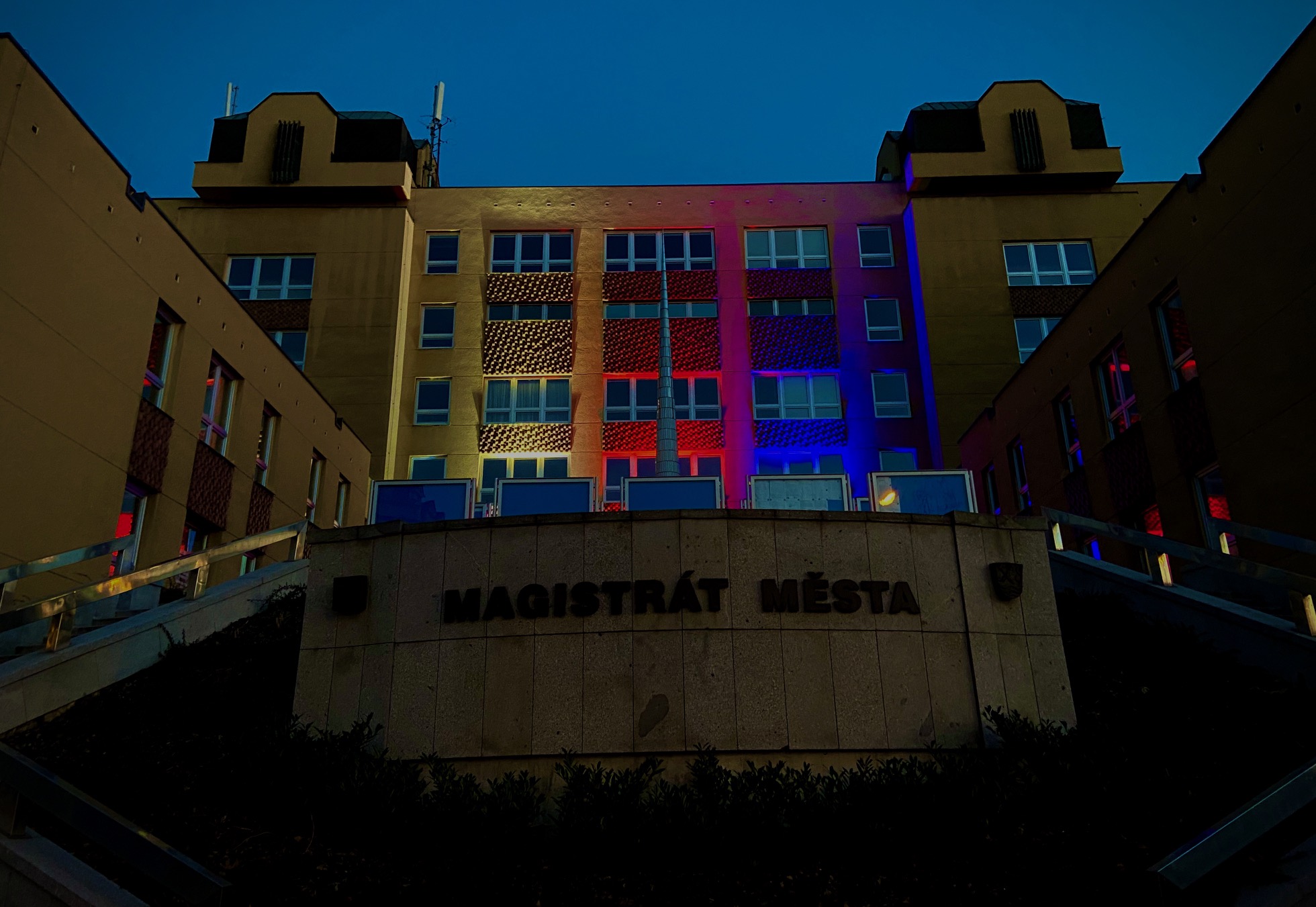 Fasáda Magistrátu města Karlovy Vary bude národními barvami svítit po celou noc.