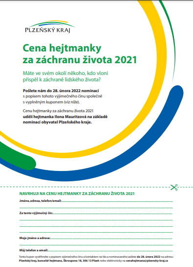 Každoročně vyhlašuje Plzeňský kraj Cenu hejtmanky za záchranu života, kam mohou obyvatelé kraje nominovat ty, kteří jakýmkoli způsobem pomohli při záchraně života člověka. Nominace lze zasílat poštou i emailem na krajský úřad do 28. února 2022. Ocenění pak převezmou z rukou hejtmanky Ilony Mauritzové speciální pamětní medaili, pamětní list a šek na 10 000 Kč.