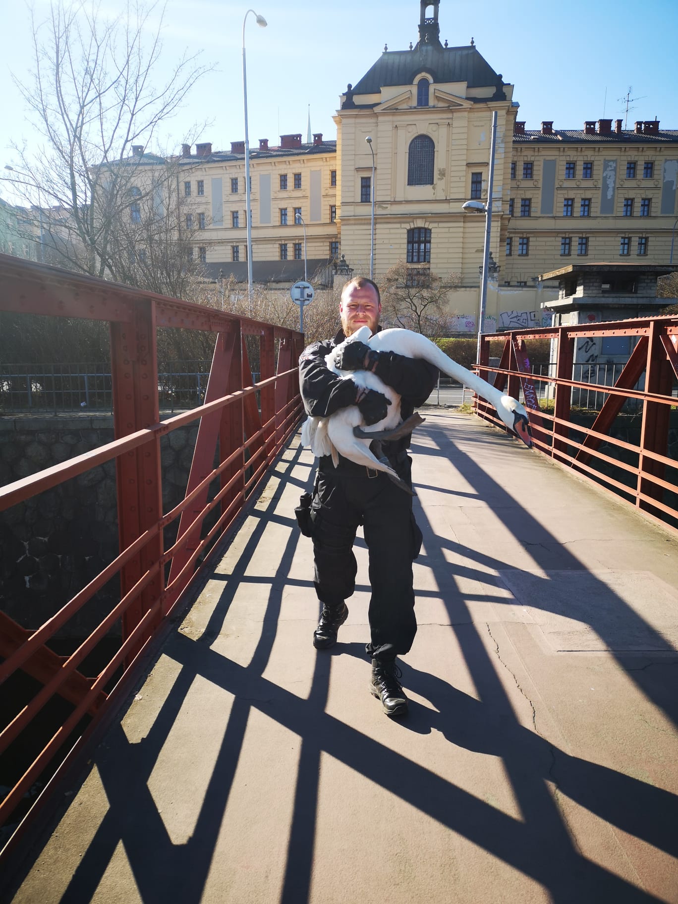 V pátek 11. března ráno vyjížděli strážníci z odchytové skupiny k oznámení o pobíhající zmatené labuti v Kamenické ulici, která se nemůže dostat přes zábradlí do vody. Labutího samce hlídka odchytla a přenesla na druhý břeh řeky Mže, kde jej pustila.