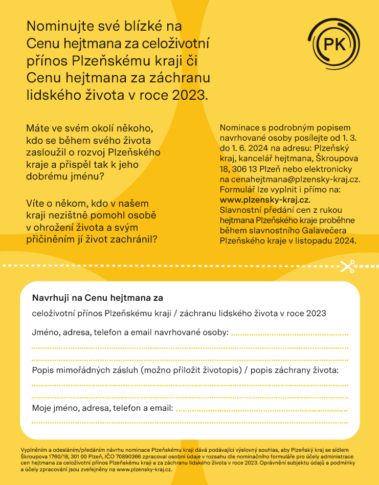 • Veškeré shromážděné informace budou použity pouze pro účely administrace Ceny hejtmana za celoživotní přínos Plzeňskému kraji či Ceny hejtmana za záchranu lidského života v roce 2023.