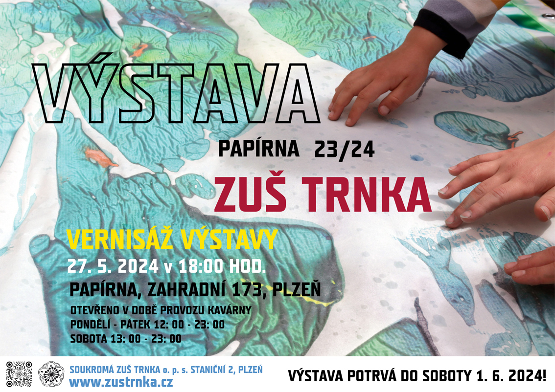 Pomalu se blíží konec školního roku a s ním i výstava toho nejzajímavějšího, co žáci plzeňské ZUŠ Trnka od září vytvořili. Prostory Papírny naplní ohňostroj barev, k vidění budou malby, grafiky, velkoformátová plátna, keramika a nejrůznější výtvarné objekty. Na vernisáži, která proběhne v pondělí 27. 5. od 18 hodin, se představí i další obory. Uskuteční se projekce krátkých animovaných filmů a dvě vystoupení žáků tanečního oboru: „Hrací skříňka“ a „Jiná“. Výstava prací žáků ZUŠ Trnka potrvá v Papírně do soboty 1. 6., vstup je zdarma a otevřeno je v době provozu kavárny.