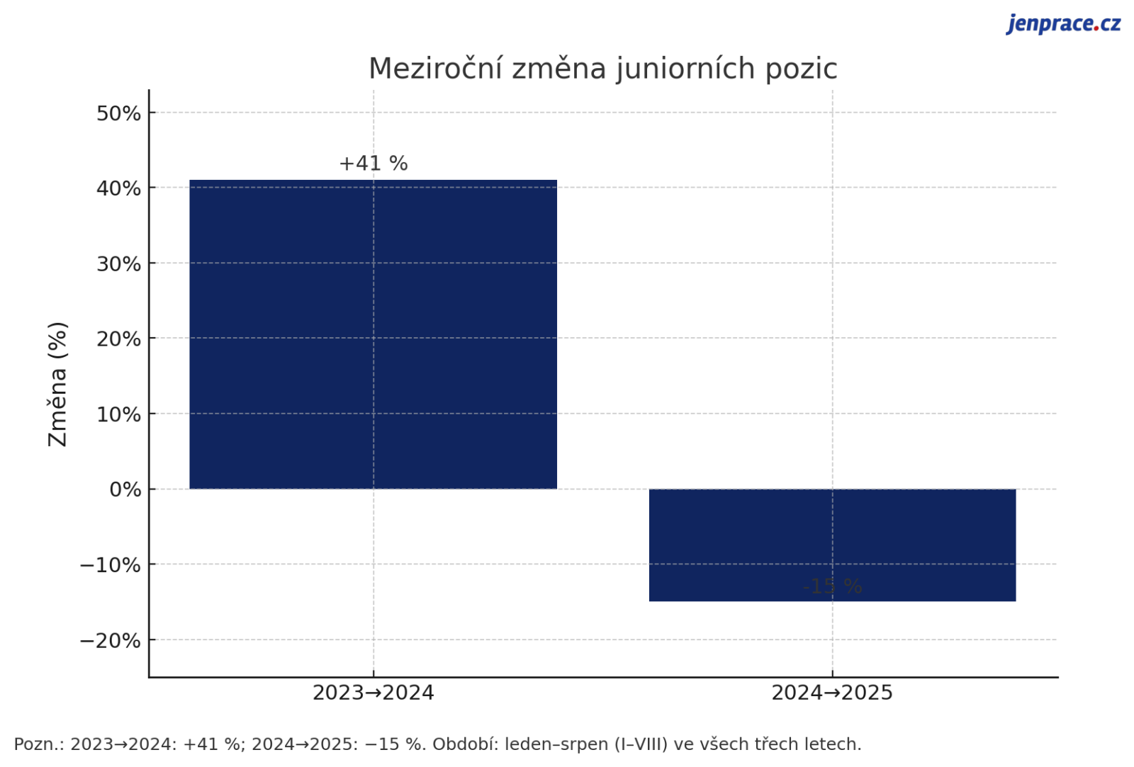 Data pracovního portálu JenPráce.cz potvrdila, že klesá počet nabídek juniorních pozic. Zatímco v letech 2023 a 2024 firmy juniory ještě výrazně poptávaly, v prvních 8 měsících letošního roku je patrný 15% pokles pozic vhodných pro absolventy. Zmíněný trend připisují odborníci rozmachu AI, kterou letos firmy začaly využívat v masivnějším měřítku.
